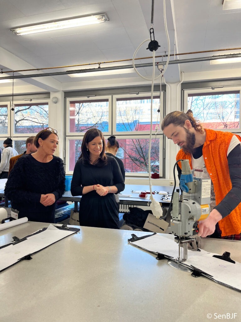 Am Mittwoch besuchte die Senatorin Katharina Günther-Wünsch das Oberstufenzentrum Mode und Bekleidung – die Modeschule Berlin. Der Besuch bot Gelegenheit zum persönlichen Kennenlernen unseres neuen Schulleiters Lutz Schmidt, der die Senatorin erstmals in der Schule begrüßte. Beim Rundgang warf die Senatorin einen Blick in verschiedene Werkstätten und Fachbereiche, darunter die Modisten- und Hutmacherwerkstatt, den Zuschnitt, die Fachpraxiswerkstatt sowie die Schülerfirma Patchwork.